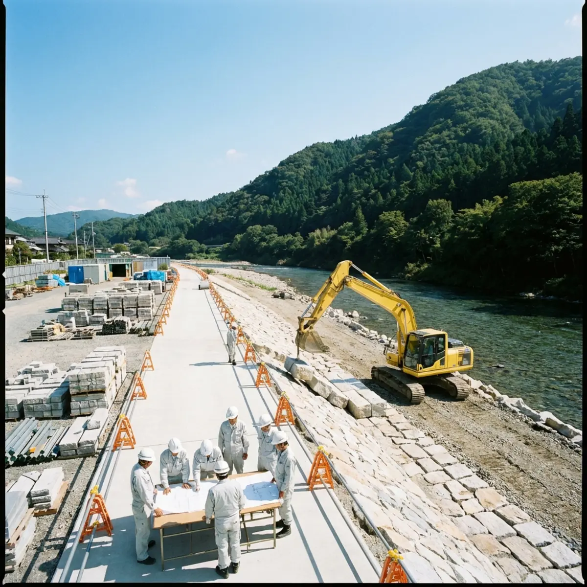 近年多発する水害から、地域を守る。私たちの主力事業は一級河川の護岸工事です。ICT建機を導入し、ミリ単位の精度で「安全な川」をつくり上げています。